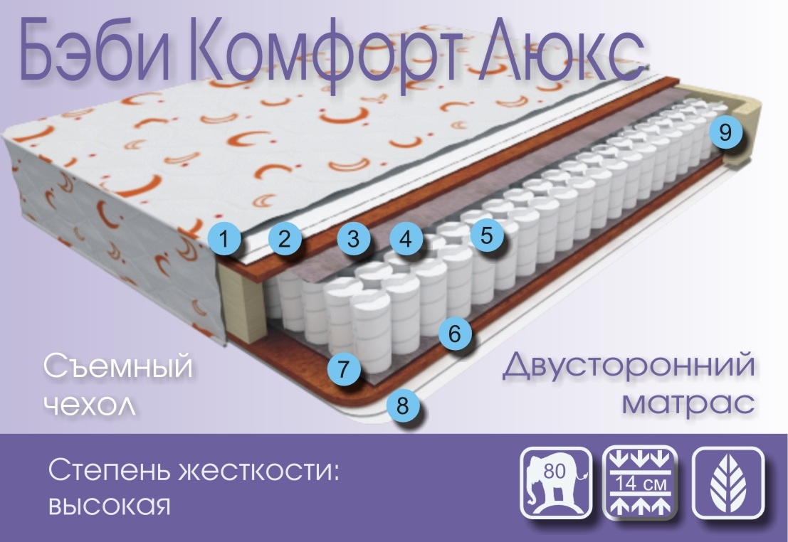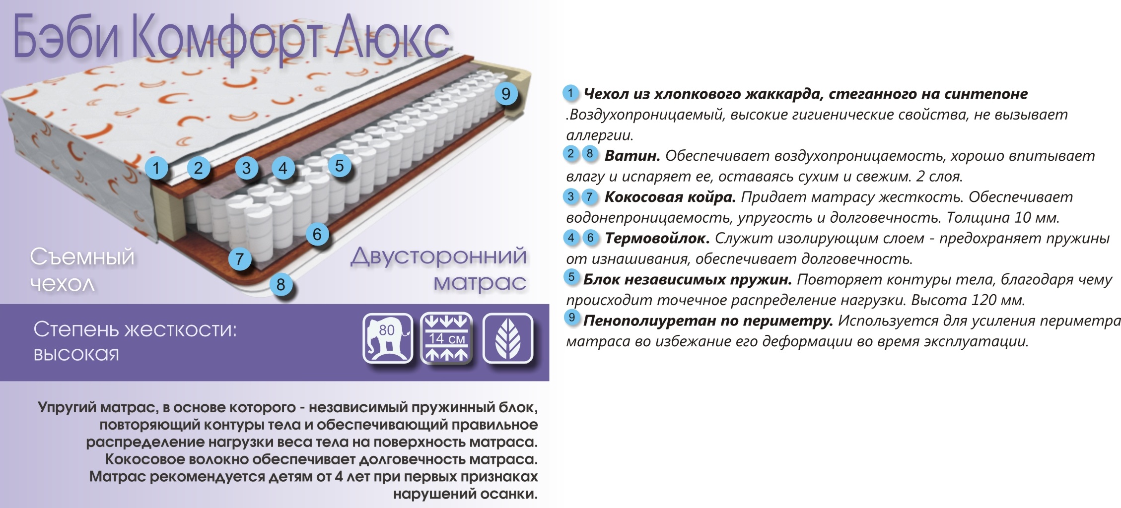 Бэби Комфорт Люкс - жесткость выше средней. Упругий матрас, в основе которого - независимый пружинный блок, повторяющий контуры тела и обеспечивающий правильное распределение нагрузки веса тела  на поверхность матраса. Кокосовое волокно обеспечивает долговечность матраса. Матрас рекомендуется детям от 4 лет при первых признаках нарушения осанки.