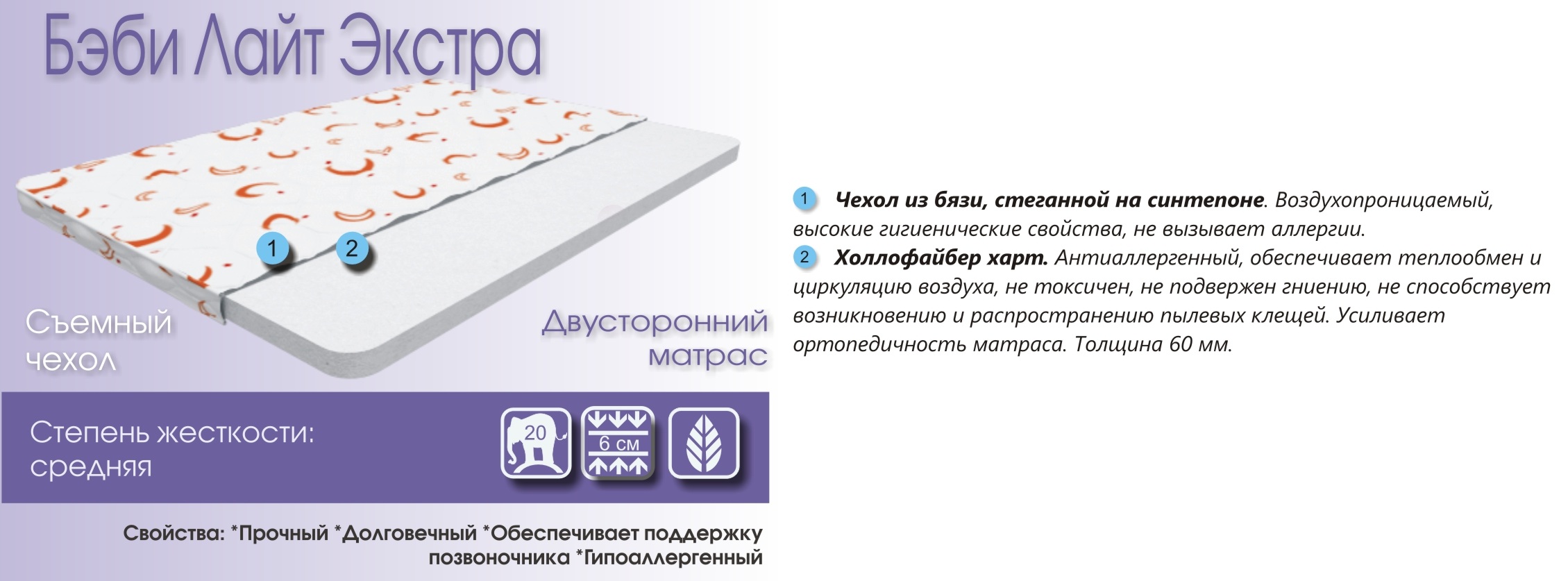 Бэби Лайт Эстра - средняя жесткость. Прочный, долговечный, обеспечивает поддержку позвоночника, гипоаллергенный.