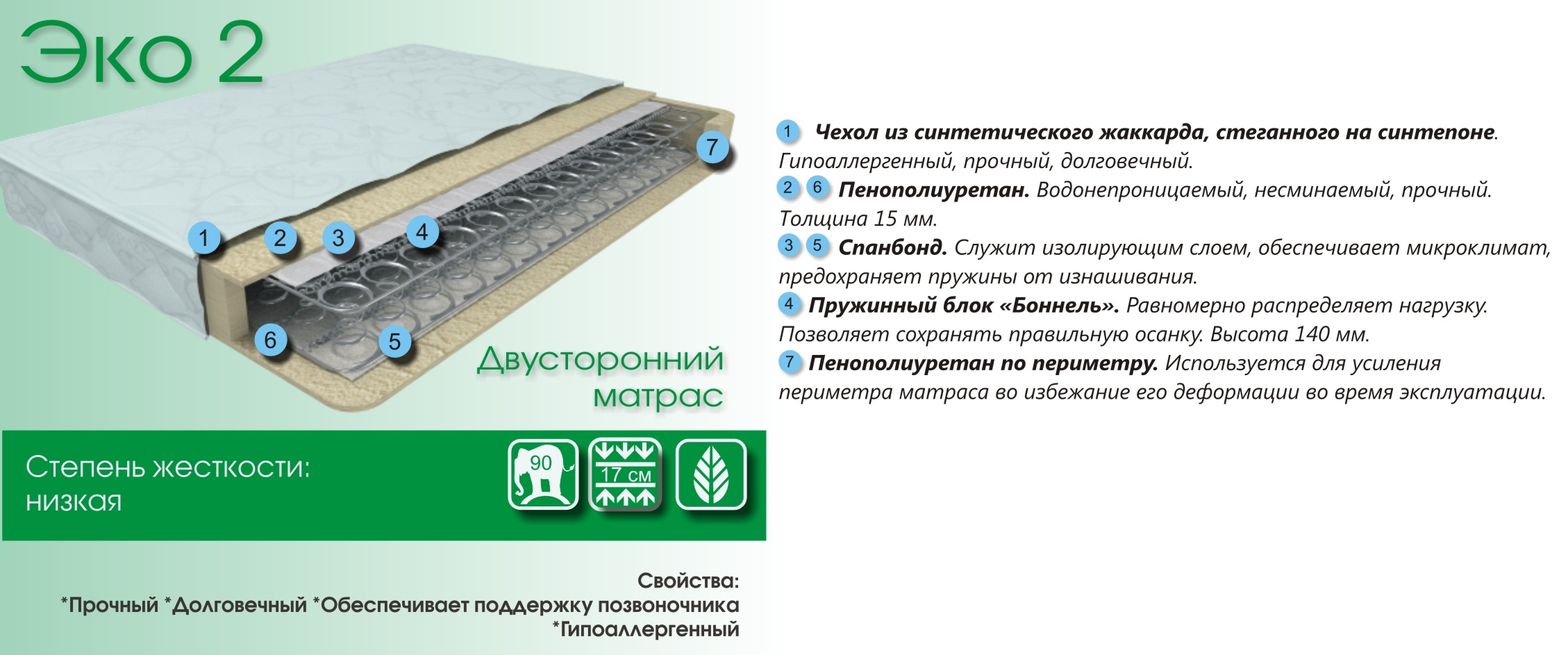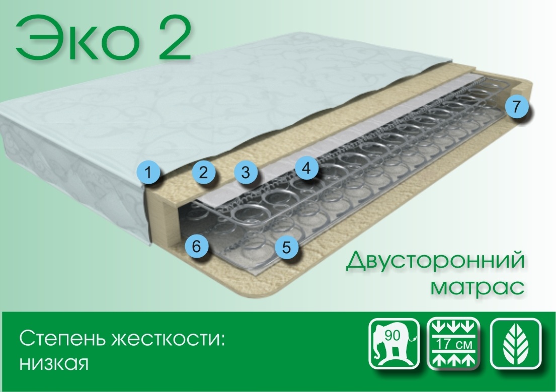 Эко2 - средняя жесткость. Это матрас является самым простым и долговечным. Обеспечивает поддержку позвоночника и абсолютно Гипоаллеренный.