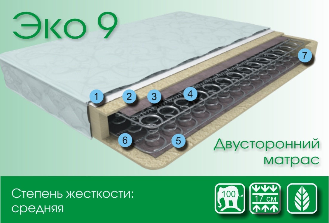 Эко 9 - средняя жесткость. Это матрас является самым простым и долговечным. Обеспечивает поддержку позвоночника и абсолютно Гипоаллеренный