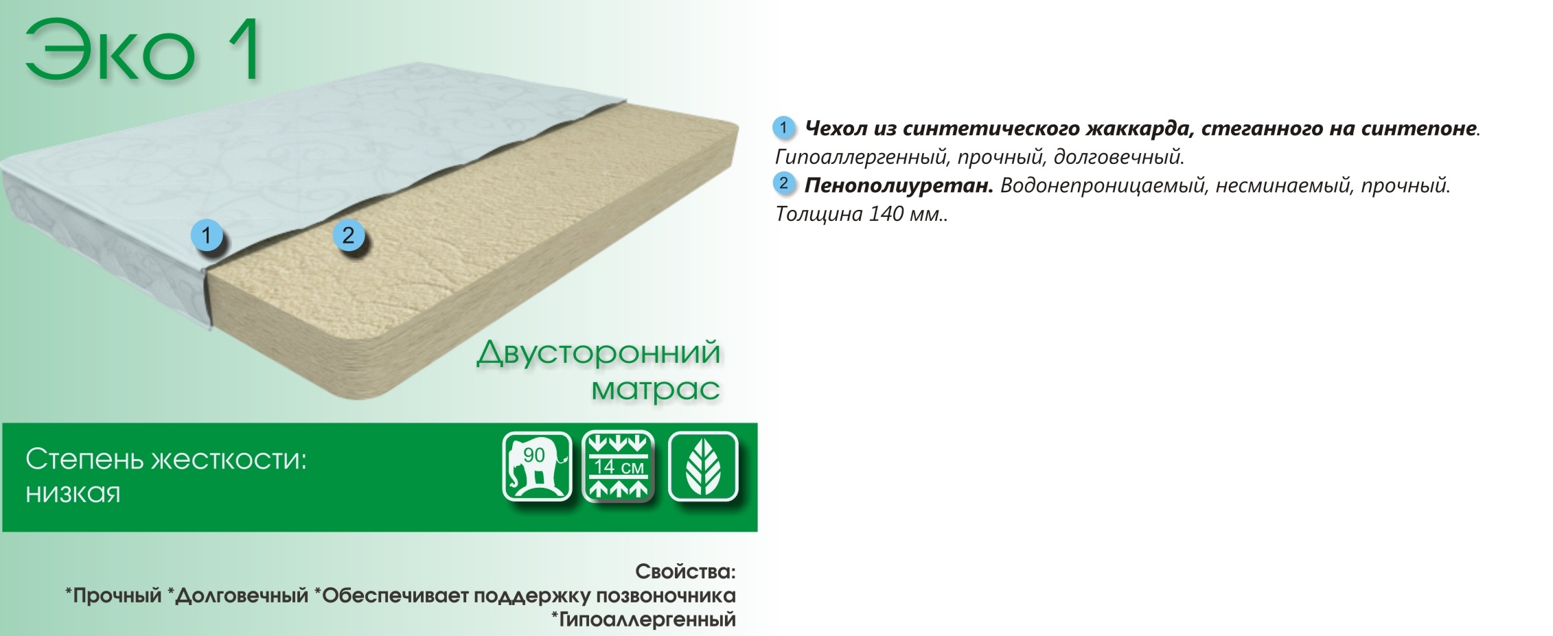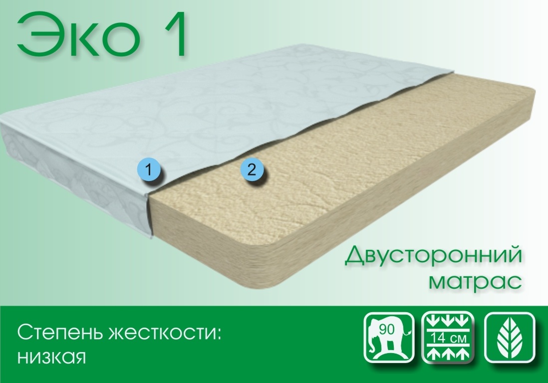 Эко 1 - мягкий матрас. Первый беспружинный матрас в ленейке экономичных матрасов. Прочный, долговечный, обеспечивает поддержку позвоночника, гипоаллергенный.