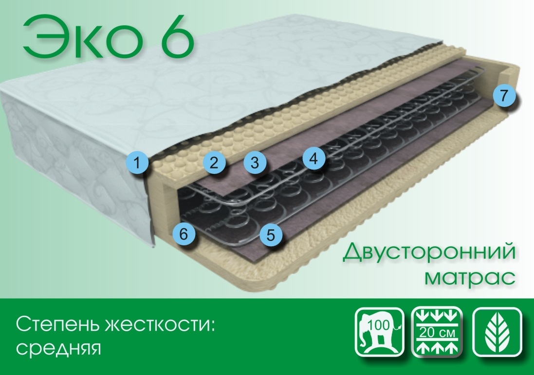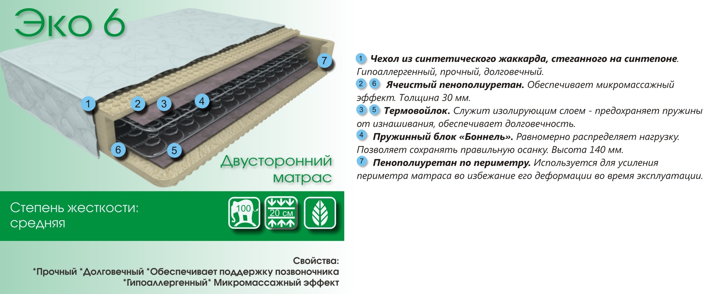 Эко 6 - средняя степень жесткости. Прочный, долговечный, обеспечивает поддержку позвоночника, гипоаллергенный, микромассажный эффект.