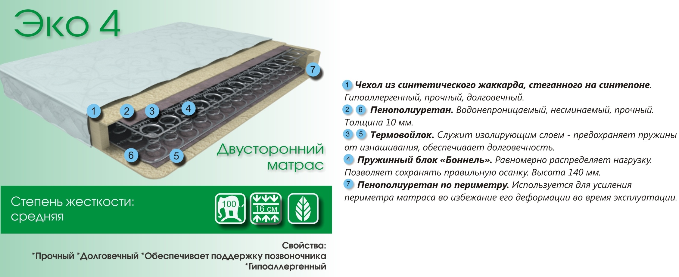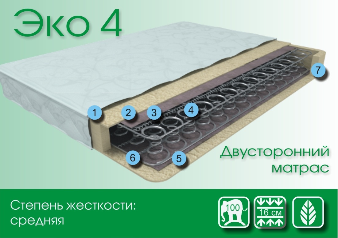 Эко 4 - средняя жесткость. Это матрас является самым простым и долговечным. Обеспечивает поддержку позвоночника и абсолютно Гипоаллеренный.