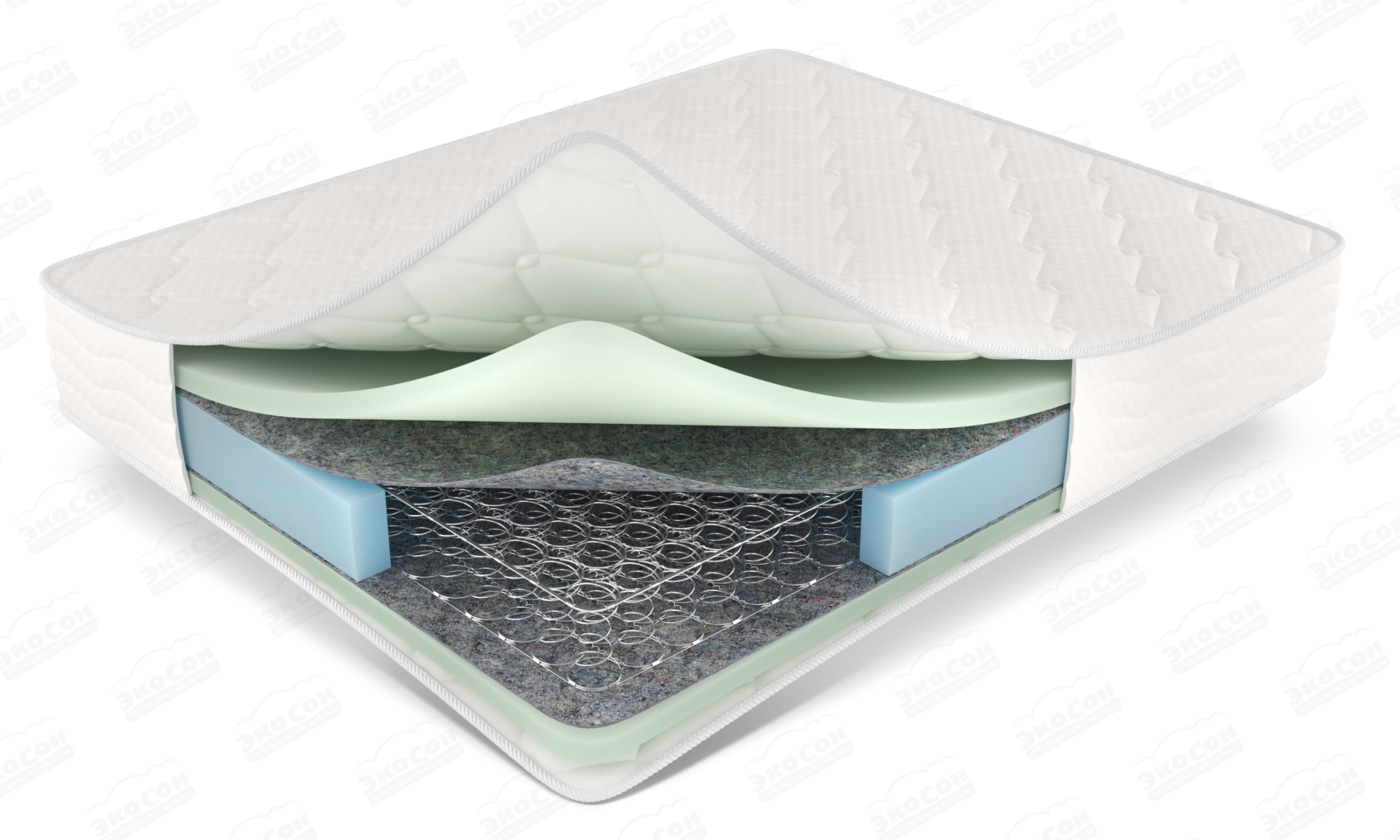 Для придания жесткости и долговечности пружинный блок усилен металлической рамкой по периметру. Увеличенный мягкий слой придает ощущение комфортности. Чехол из жаккард – хлопока 70%, стеганный на синтепоне и пене EcoFoam, короб из ППУ по периметру.