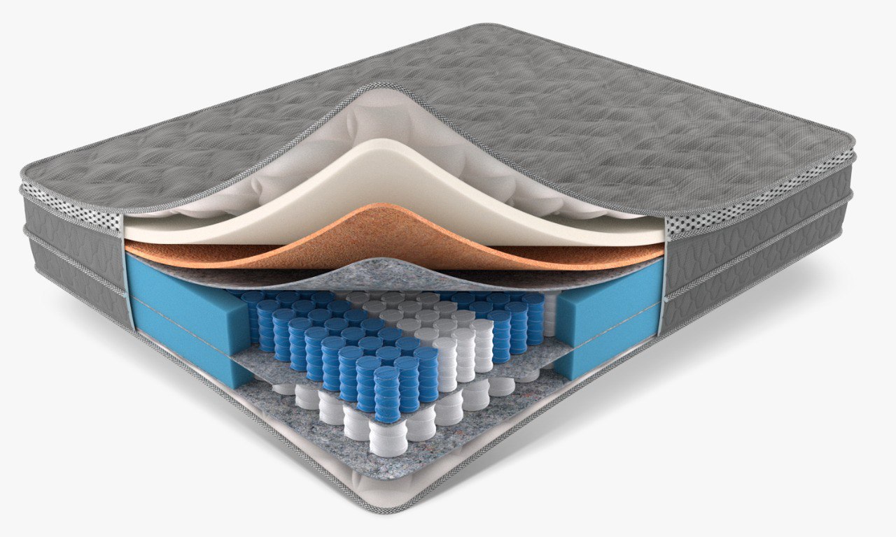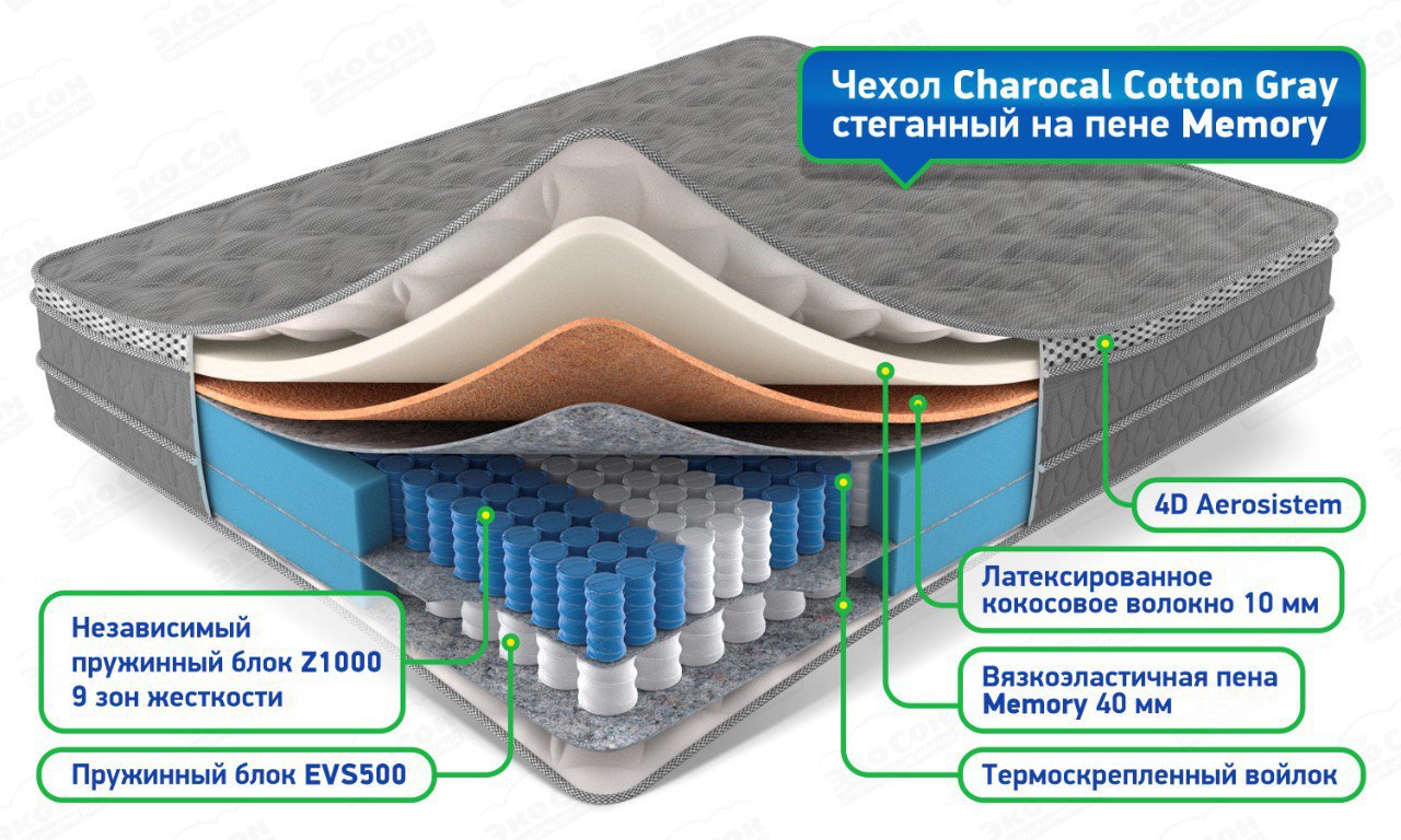 Основа матраса независимый пружинный блок Z1000, 9 зон жесткости, в этом блоке 1000 пружин на спальное место (=500 на кв.м.) и независимый пружинный блок EVS500 (=250 на кв.м.), 5 зон жесткости. Большая плотность пружин помогает равномерно распределить нагрузку по поверхности матраса, снять мышечное напряжение и поддержать позвоночник в правильном положении, а материал Memory Foam дает ощущение мягкости во сне.