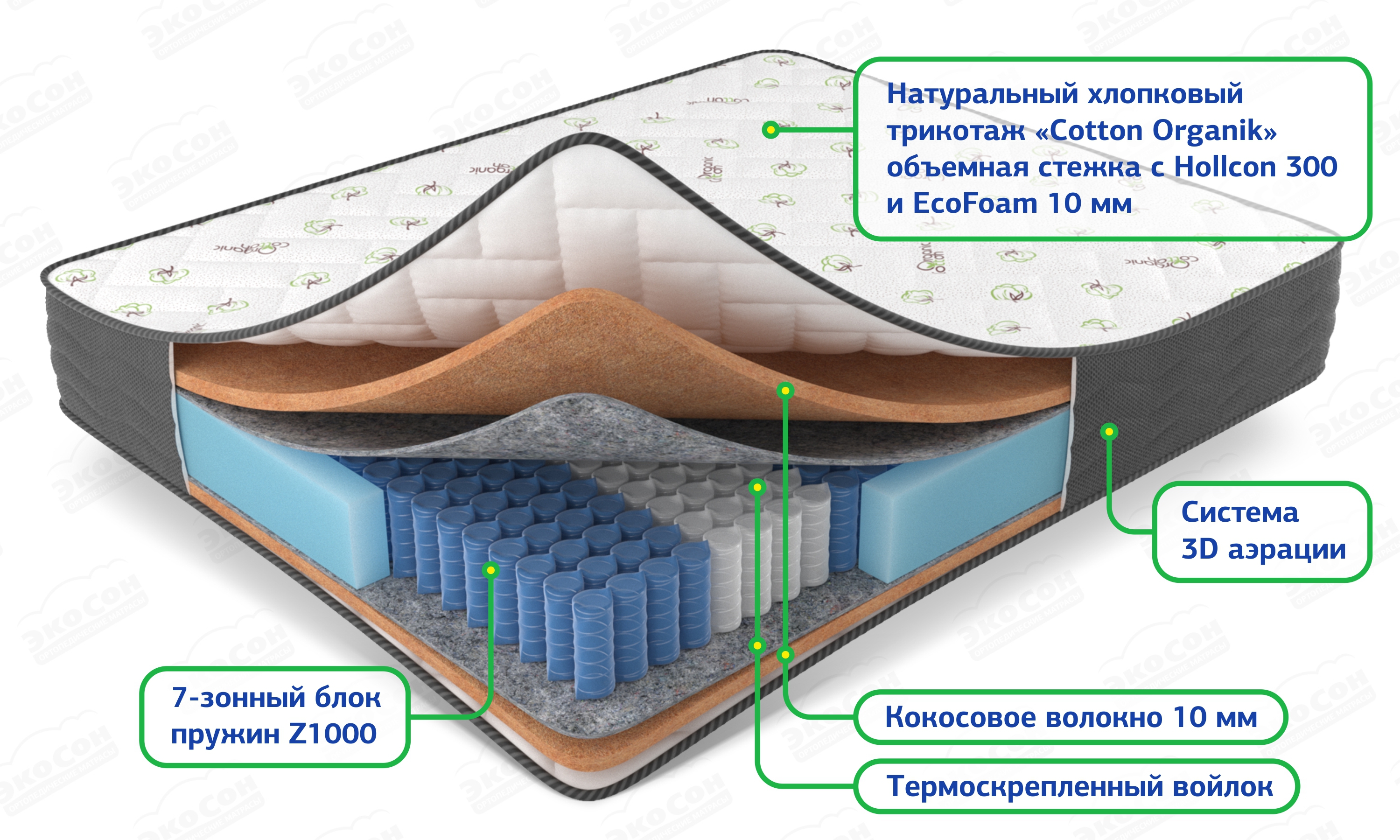 Чехол из хлопкового трикотажа "Cotton Organik" стеганный на Hollcon (300) и Ecofoam (10 мм), высокообъемный борт по периметру 3D Aerosistem