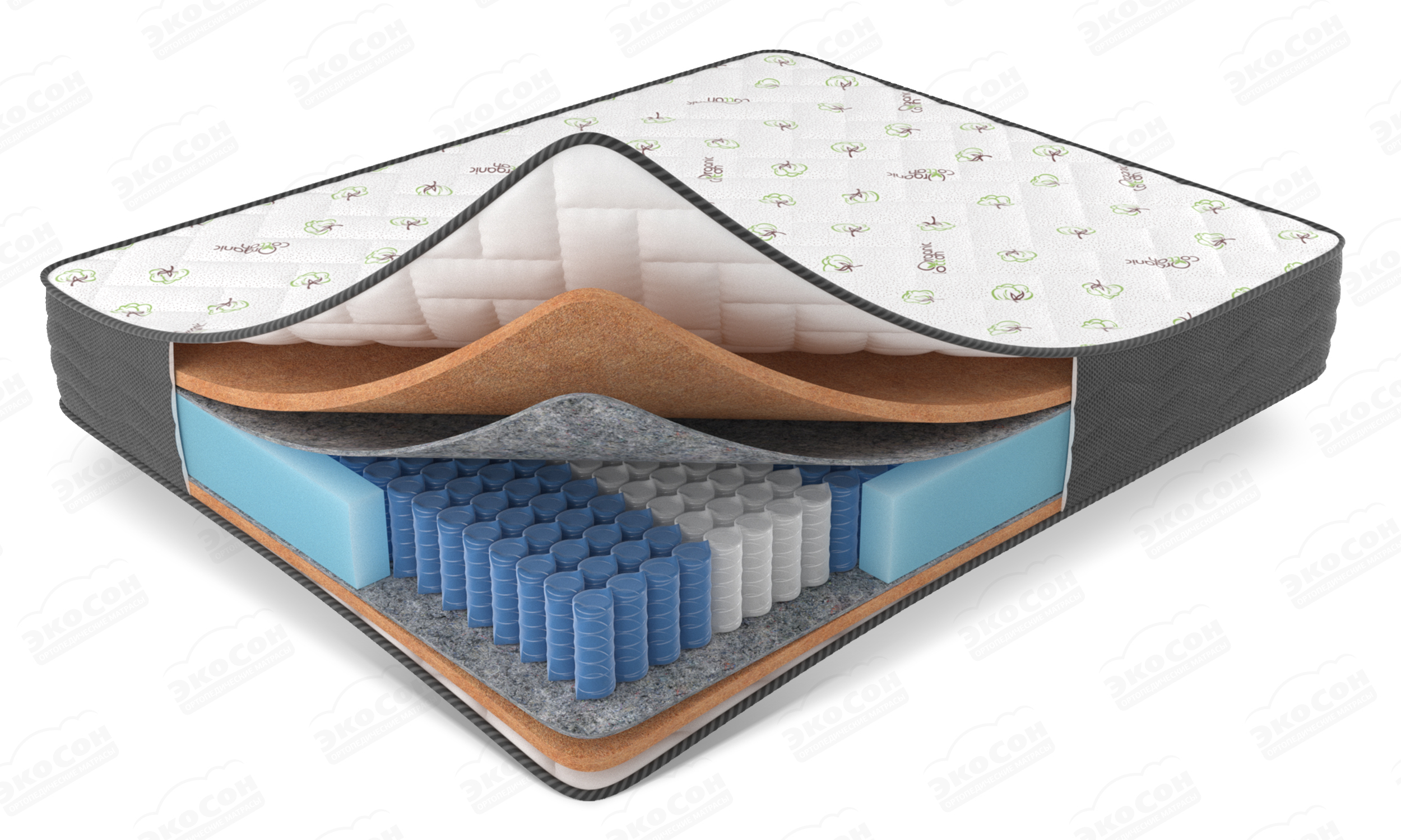 Симметричный умеренно жесткий ортопедический матрас. Кокосовая койра - один из самых жестких наполнителей, поэтому он имеет отличные ортопедические свойства и хорошо подойдет людям с весом выше среднего. Кокосовая плита изолирована от пружин прослойкой термоскрепленного войлока, тем самым предохраняя его. Блок независимых пружин состоит из изолированных друг от друга пружин.