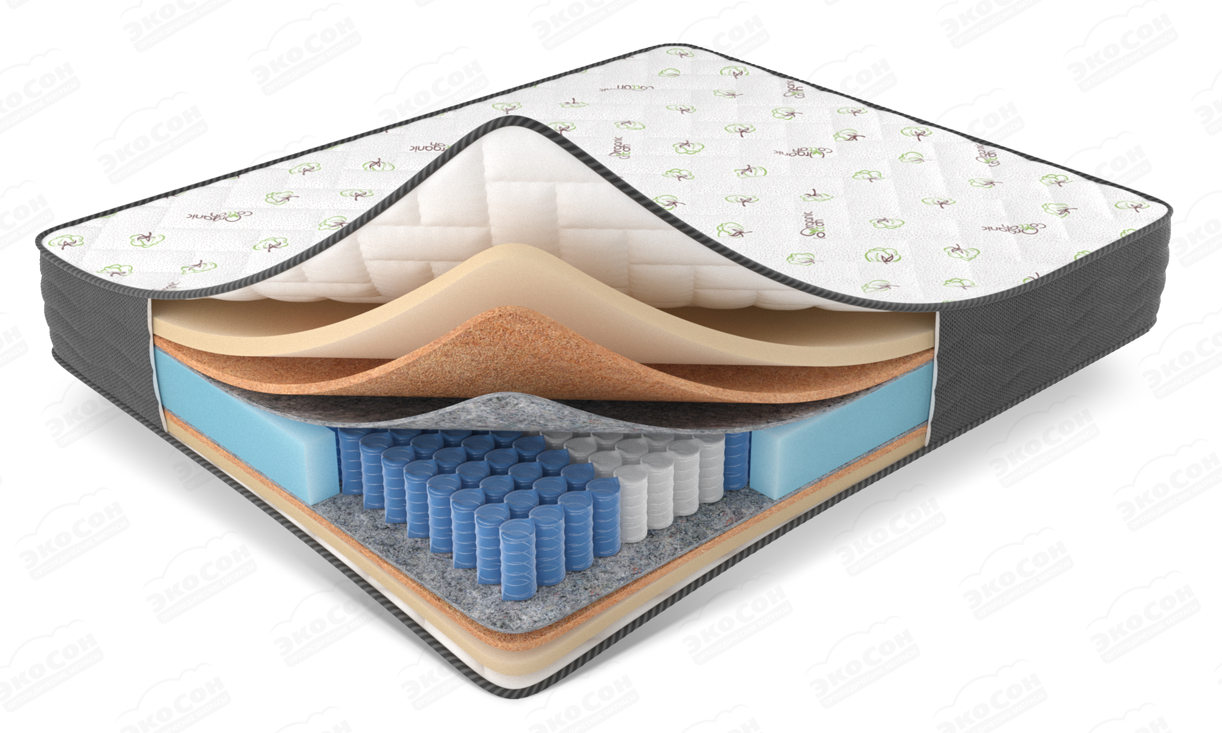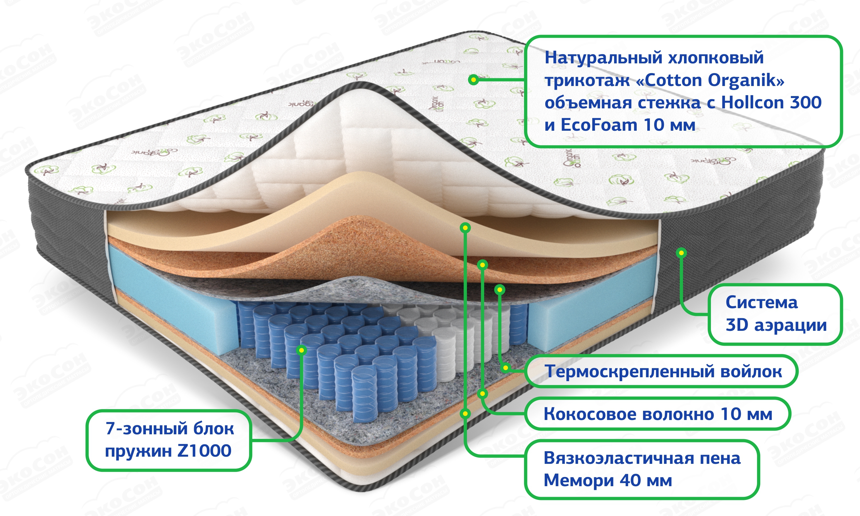 Чехол из хлопкового трикотажа "Cotton Organik" стеганный на Hollcon (300) и Ecofoam (10 мм), высокообъемный борт по периметру 3D Aerosistem