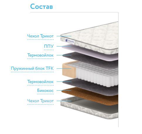 В основе данной модели - блок независимых пружин - TFK (250 пружин на кв.м.), где каждая пружина заключена в отдельный чехол из спанбонда. Такая конструкция предотвращает появление эффекта гамака, а так-же способна справится с разницей в весе спящих - более 25 кг. Внешние слои наполнителей матраса отделены защитным слоем войлока, который защищает материал от губительного воздействия, связанного с работой пружинного блока. Сторона А - характеризуется высокой степенью анатомичности, за счёт слоя из искусственного латекса. Сторона Б - более плотная за счёт слоя Би-кокоса. Чехол матраса Трикот - это современное эластичное полотно, на основе 100% П/Э, которое обладает высокой прочностью.