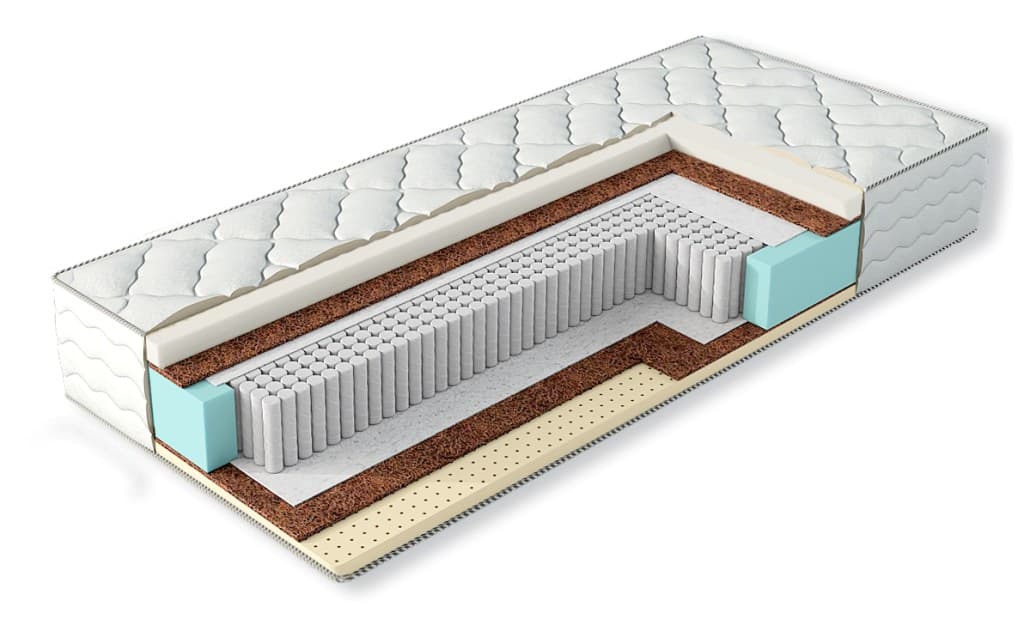 Матрас на пружинной системе "Multipocket" и с разной жесткостью сторон. С одной используется кокосовое волокно и латекс - такое сочетание обеспечивает среднюю степень жесткости, а с другой стороны - сочетание латекированного кокосового волокна и уникального материала Memory foam, материал Memory foam создает ощущение невесомости и спокойствия, поскольку его особенность запоминать форму тела и уменьшать тем самым тревожность во время сна. В системе "Multipocket" 1000 пружин на спальное место - за счет увеличенного количества пружин блок умеренно жесткий и позволяет выдерживать большие нагрузки и практически не имеет ограничения в весе.