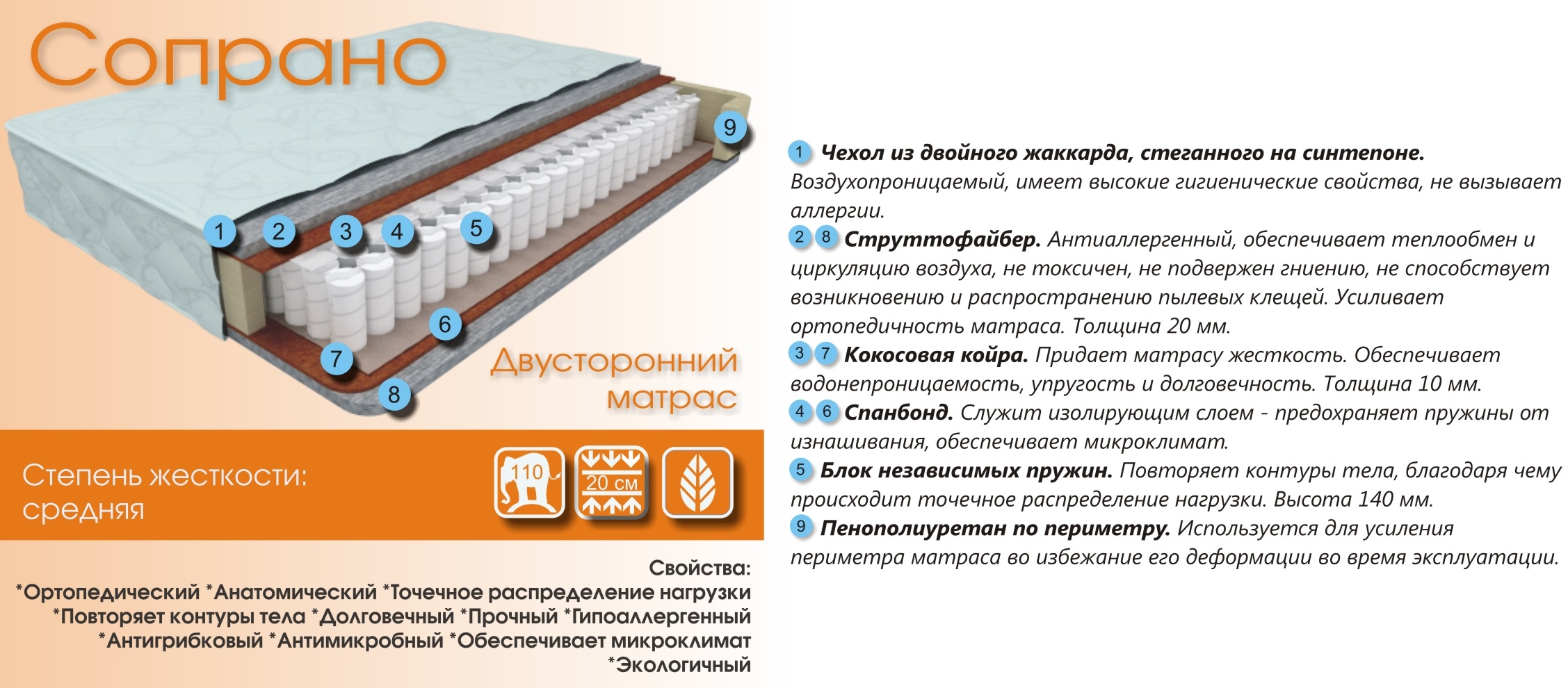 Сопрано -жесткость средняя. Ортопедический, Анатомический , Точечное распределение нагрузки, Повторяет контуры тела, Долговечный, Прочный,Гипоаллергенный, Антигрибковый, Антимикробный, Обеспечивает микроклимат, Экологичный.Сочетание струттофайбера и кокосовой койры делают этот матрас действительно удобным и комфортным. Подходит для людей чей вес не превышает 110кг. Хороший вариант для супружеских пар, у которых разница в весе не превышает 50кг.