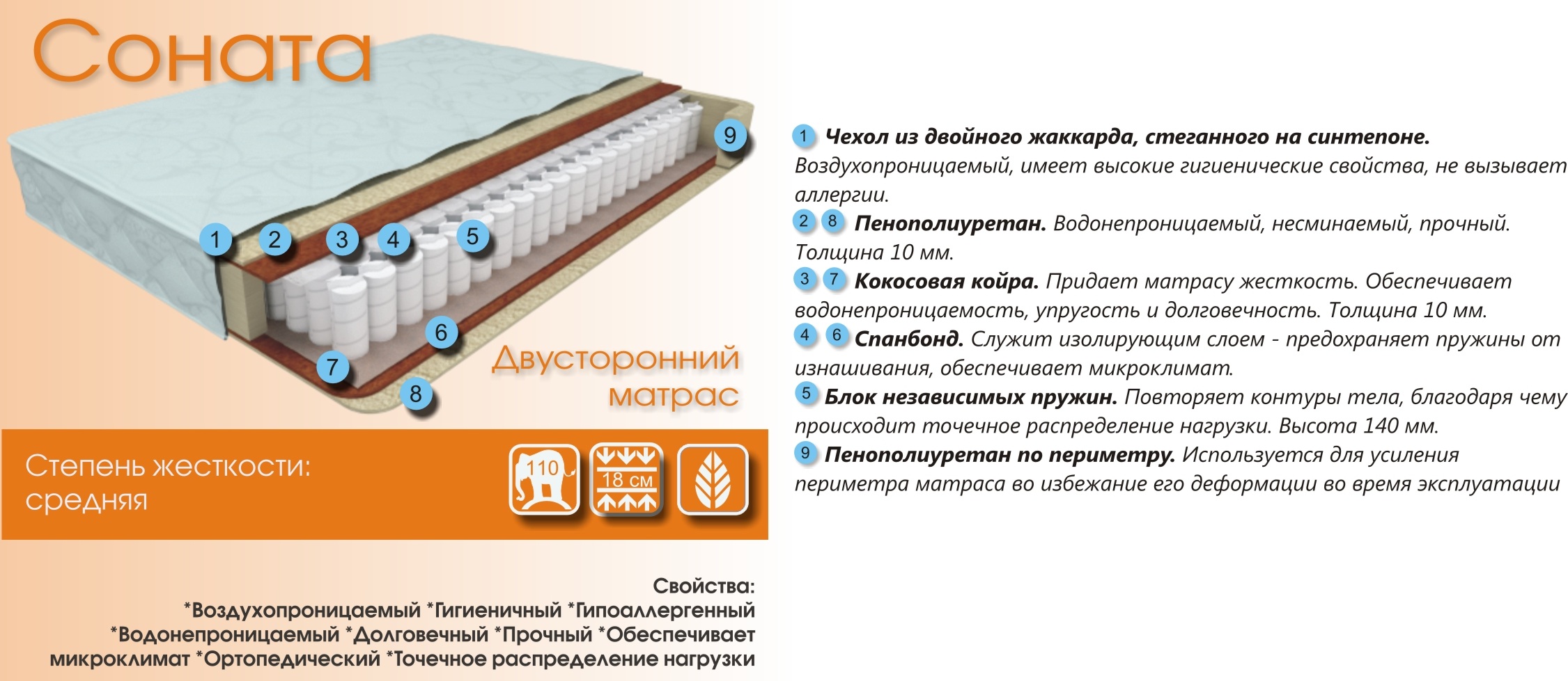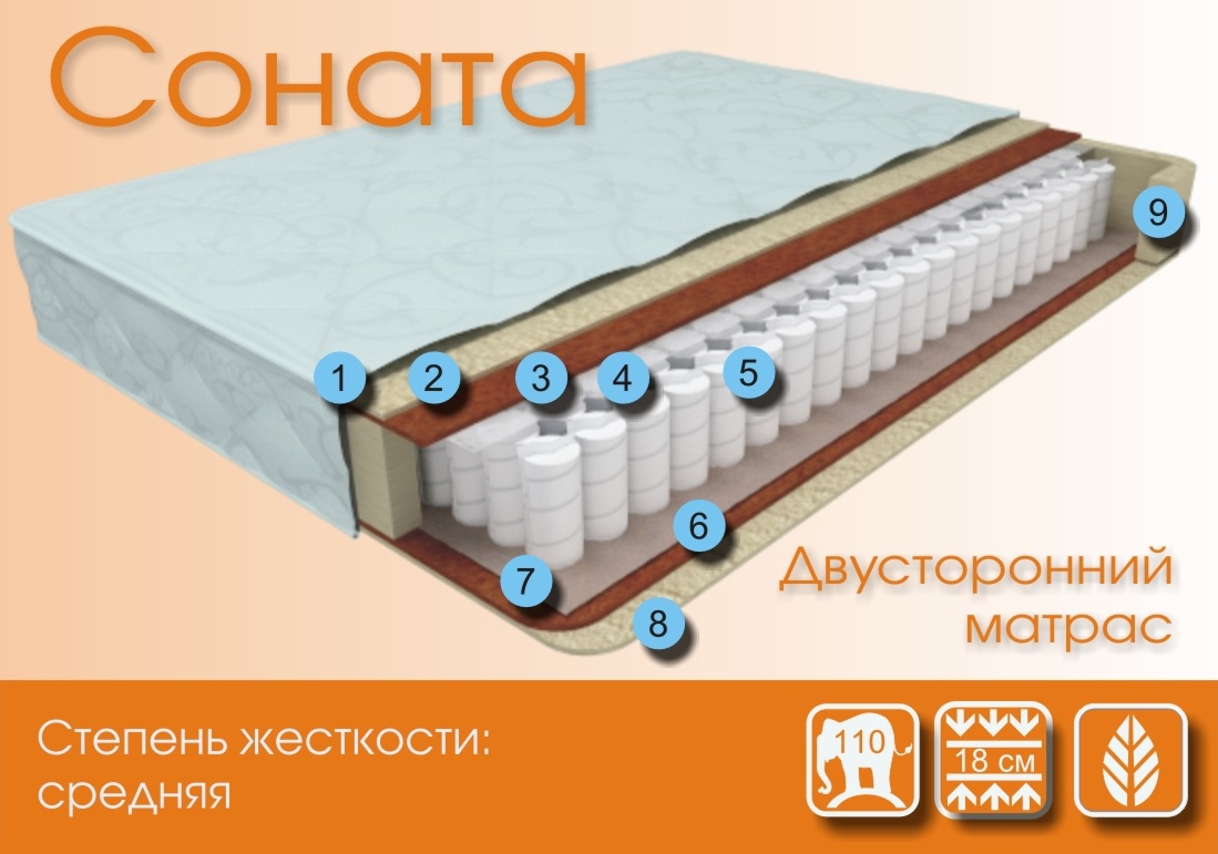Соната - средняя жесткость. Воздухопроницаемый, Гигиеничный, Гипоаллергенный, Водонепроницаемый, Долговечный, Прочный, Обеспечивает микроклимат, Ортопедический,Точное распределние нагрузки.
